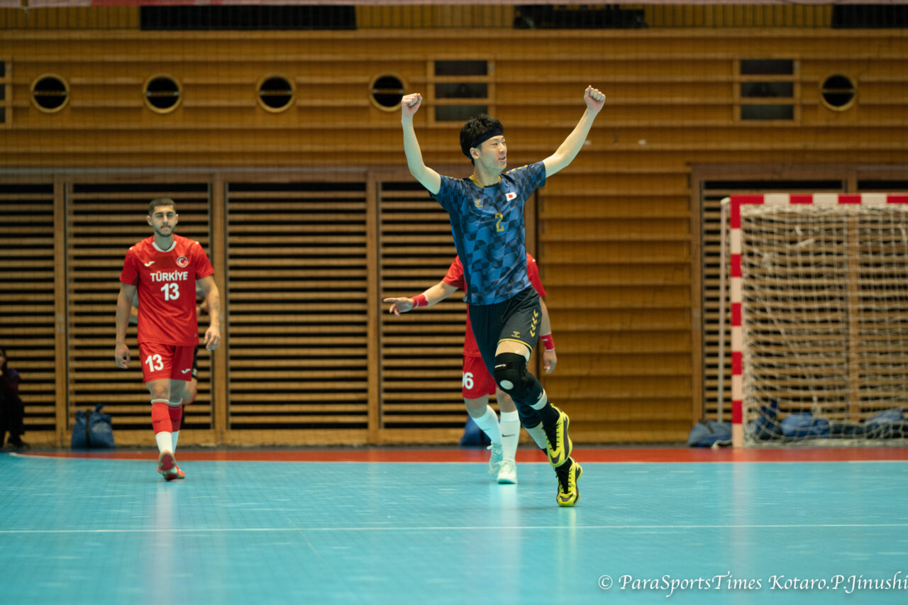 試合前の国歌斉唱に次いで、先日亡くなったトルコ代表へ黙祷を捧げた後に試合開始のスローオフ。記念すべき代表初得点は開始2分の大西康陽(背番号11以下同じ)のシュートから。続いて淺井啓太(4)が右から決め、キャプテンの小林優太(2)が7mスロー(サッカーのOKに相当するGKと1対1のスロー)を3つ連続で決めて5-2とリード。1点とられるも津村開(6)が決めて6-3と先行する。