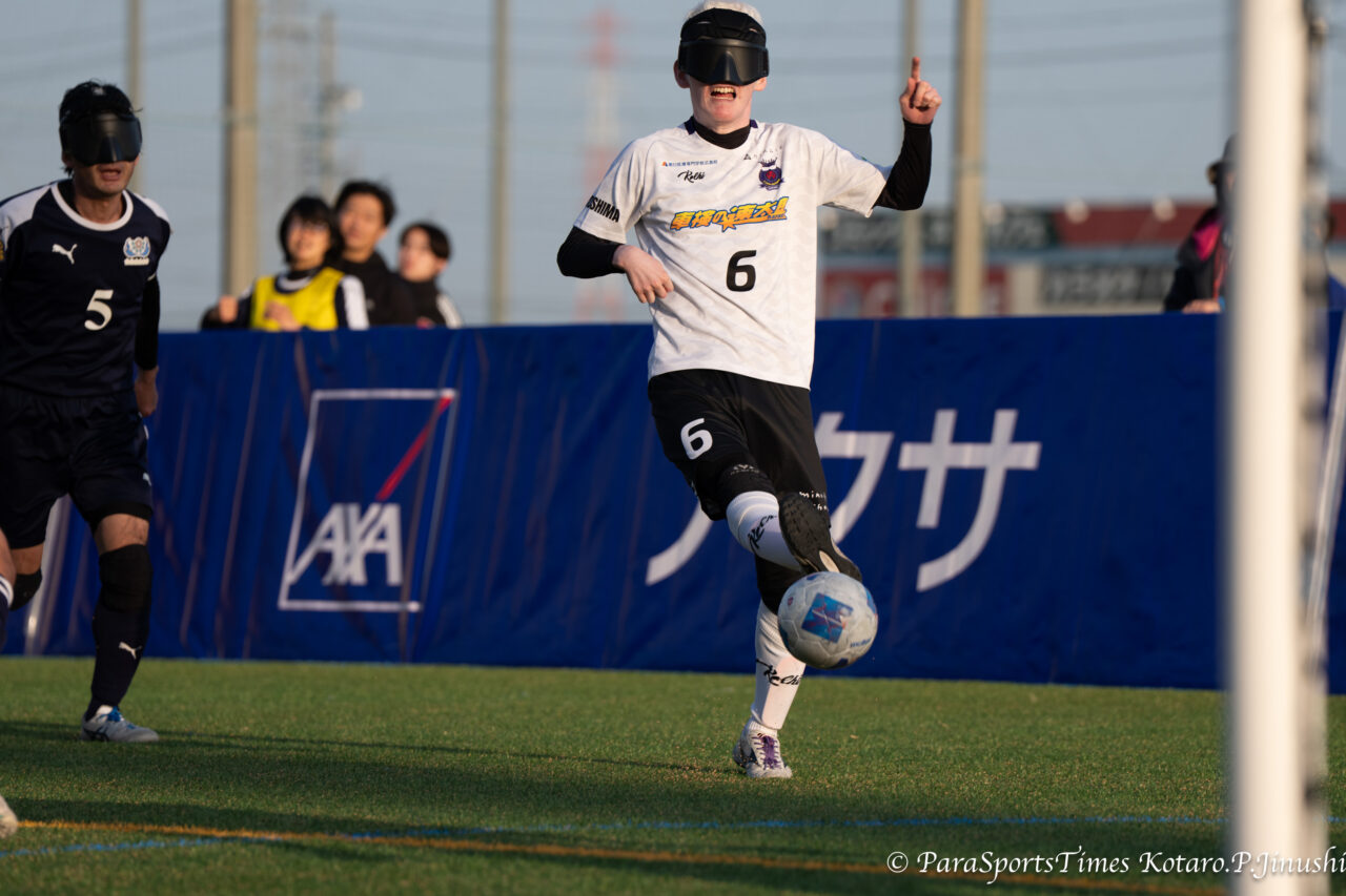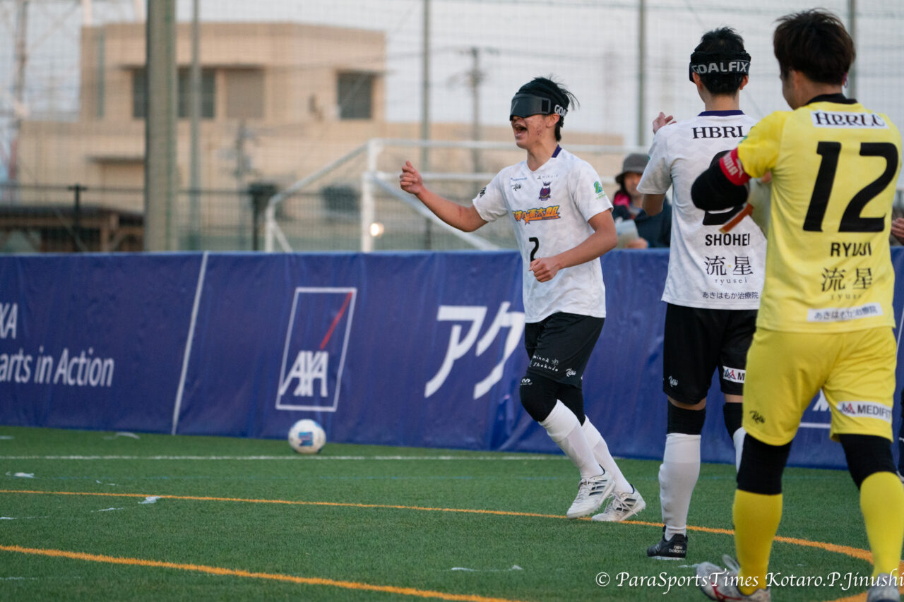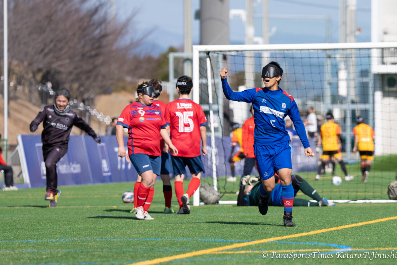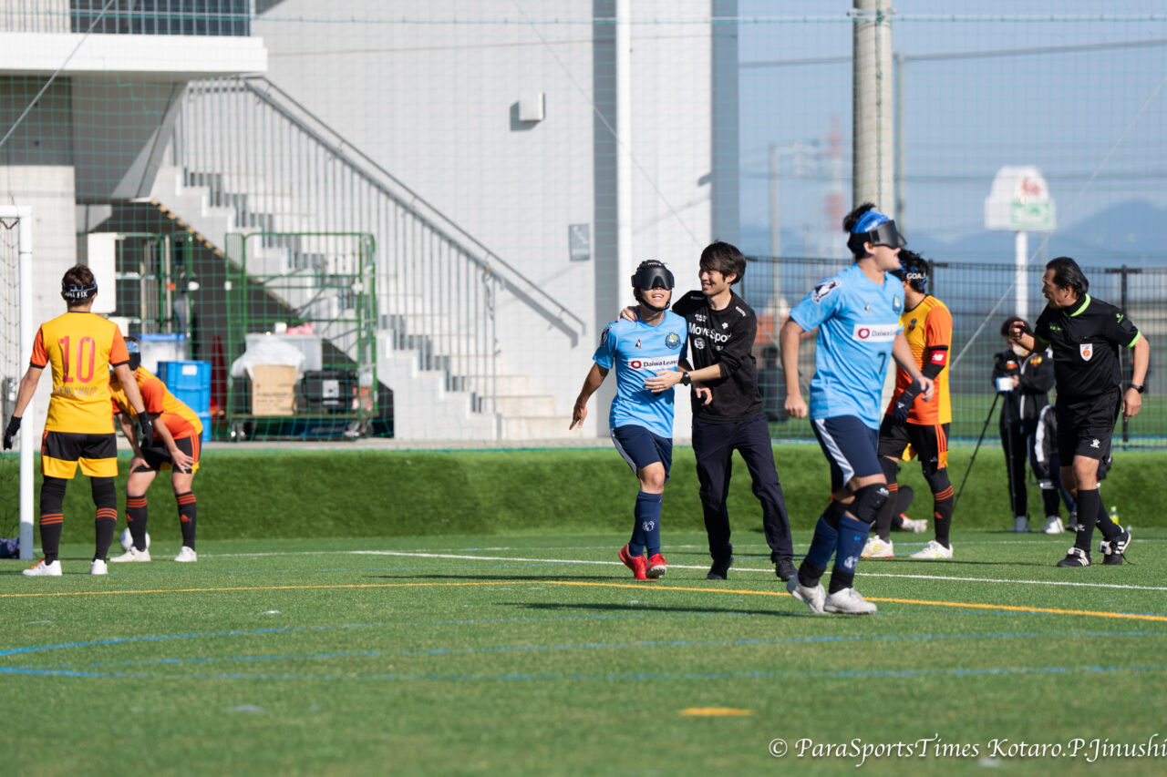 均衡を破るゴールを決めた北郷宗大(中央青ユニ)とガイドの鈴木仰