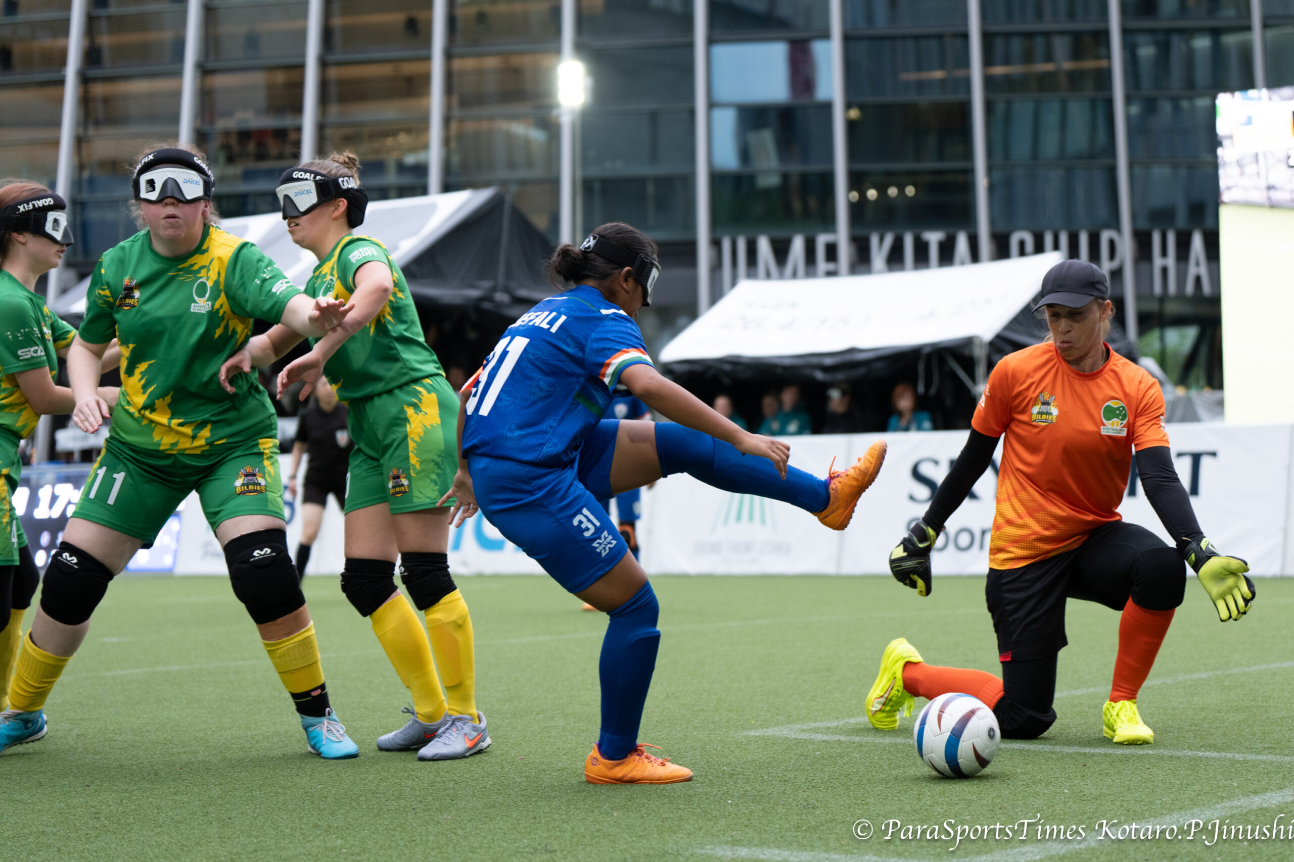 オーストラリのDFを抜けてシュートを放つキャプテンのShefali(中央)とGK Bartels